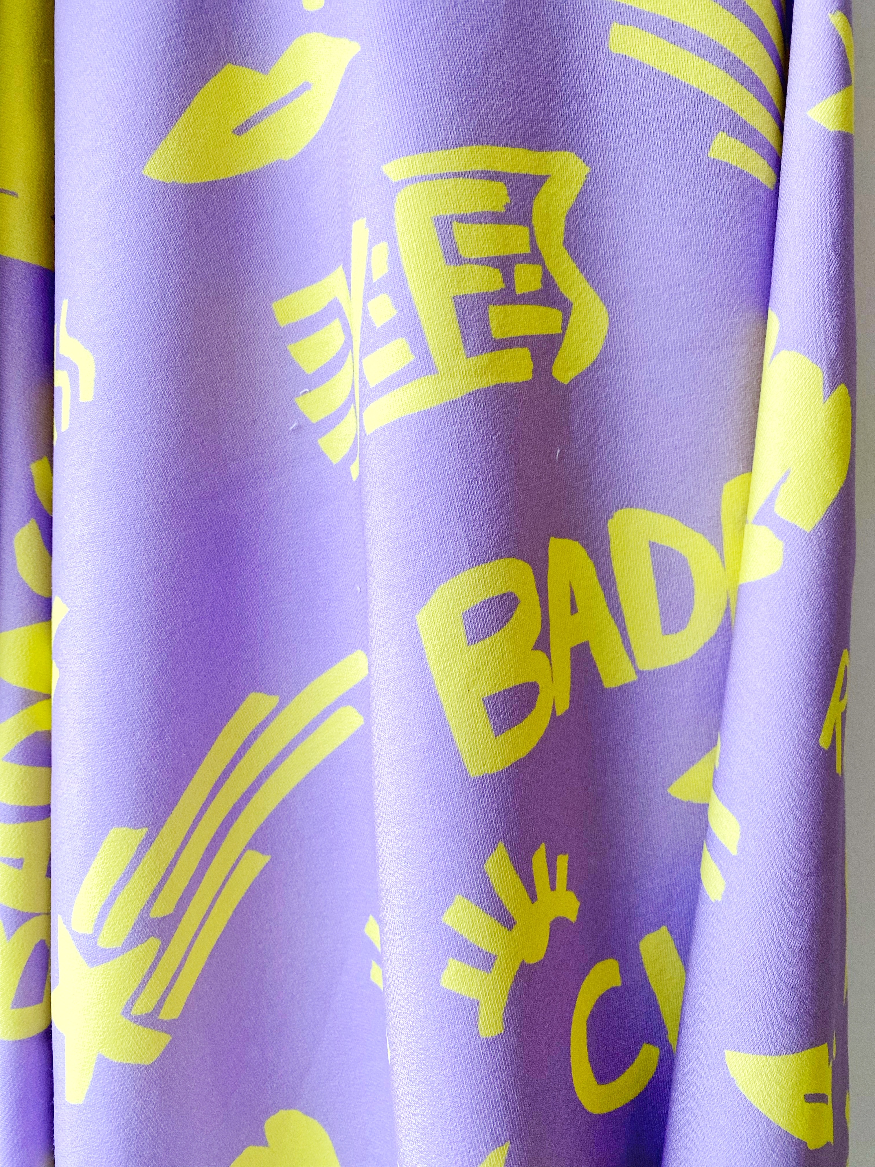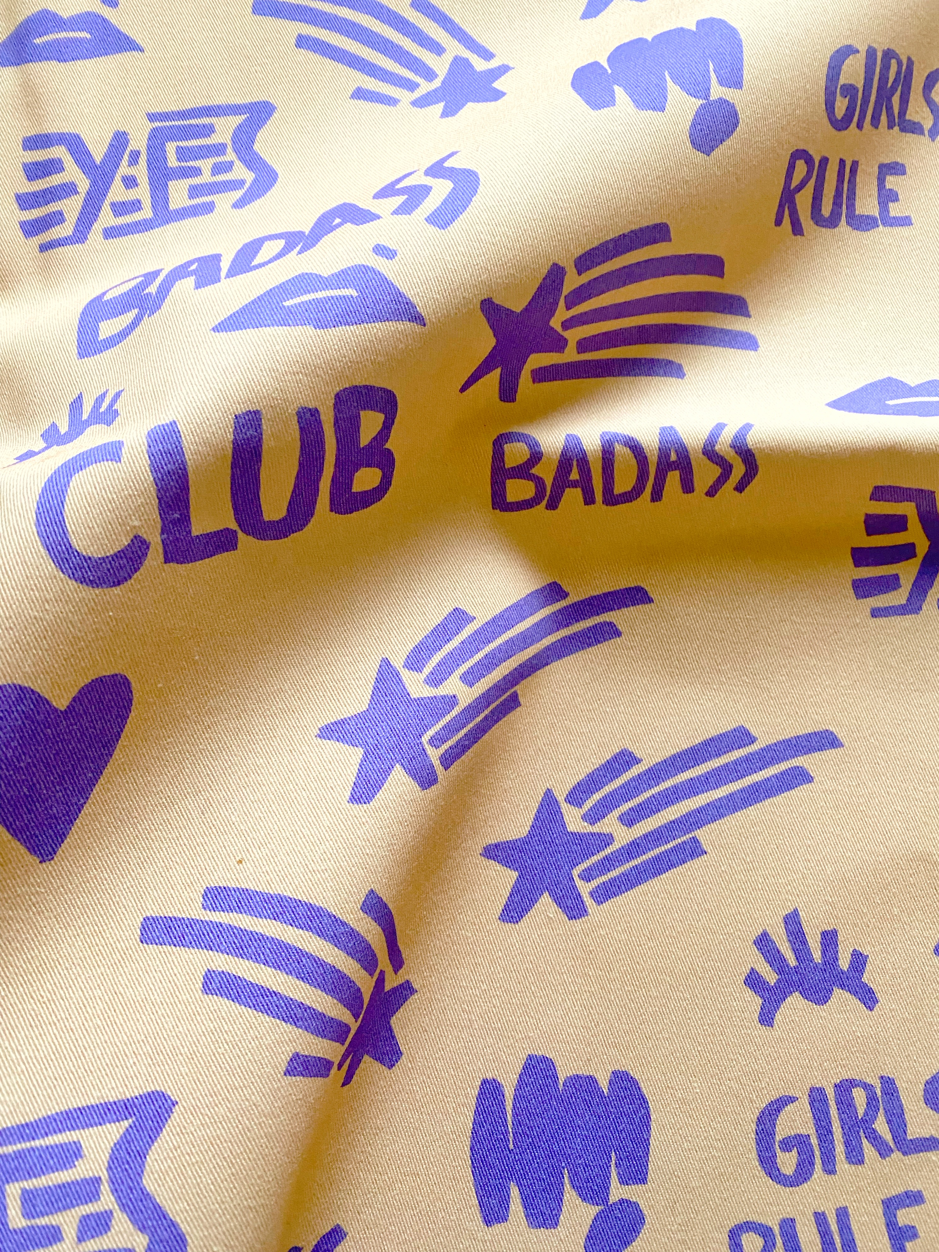 Badass, c’est un motif manifeste. Une écriture brute, la mienne, jetée sur le tissu sans chichis — des mots qui revendiquent haut et fort une attitude : on assume, on s’affirme, on ne s’excuse pas. Il est né de cette énergie de sororité et d’empowerment qui traverse notre époque — l’envie de porter ses convictions jusque dans ses choix de tissu.