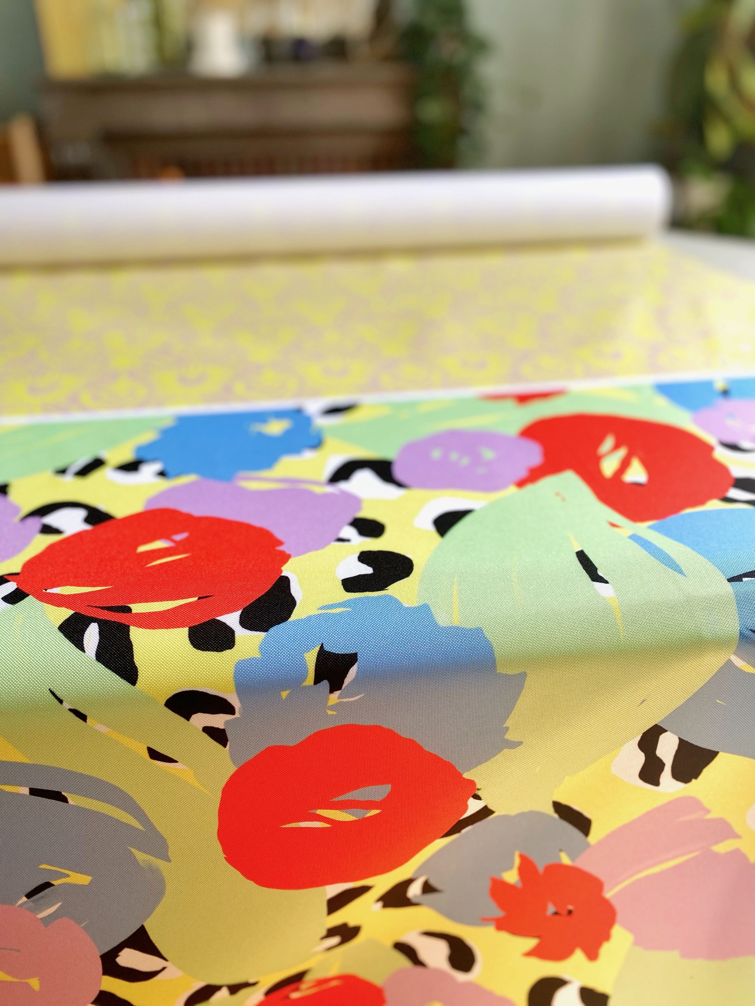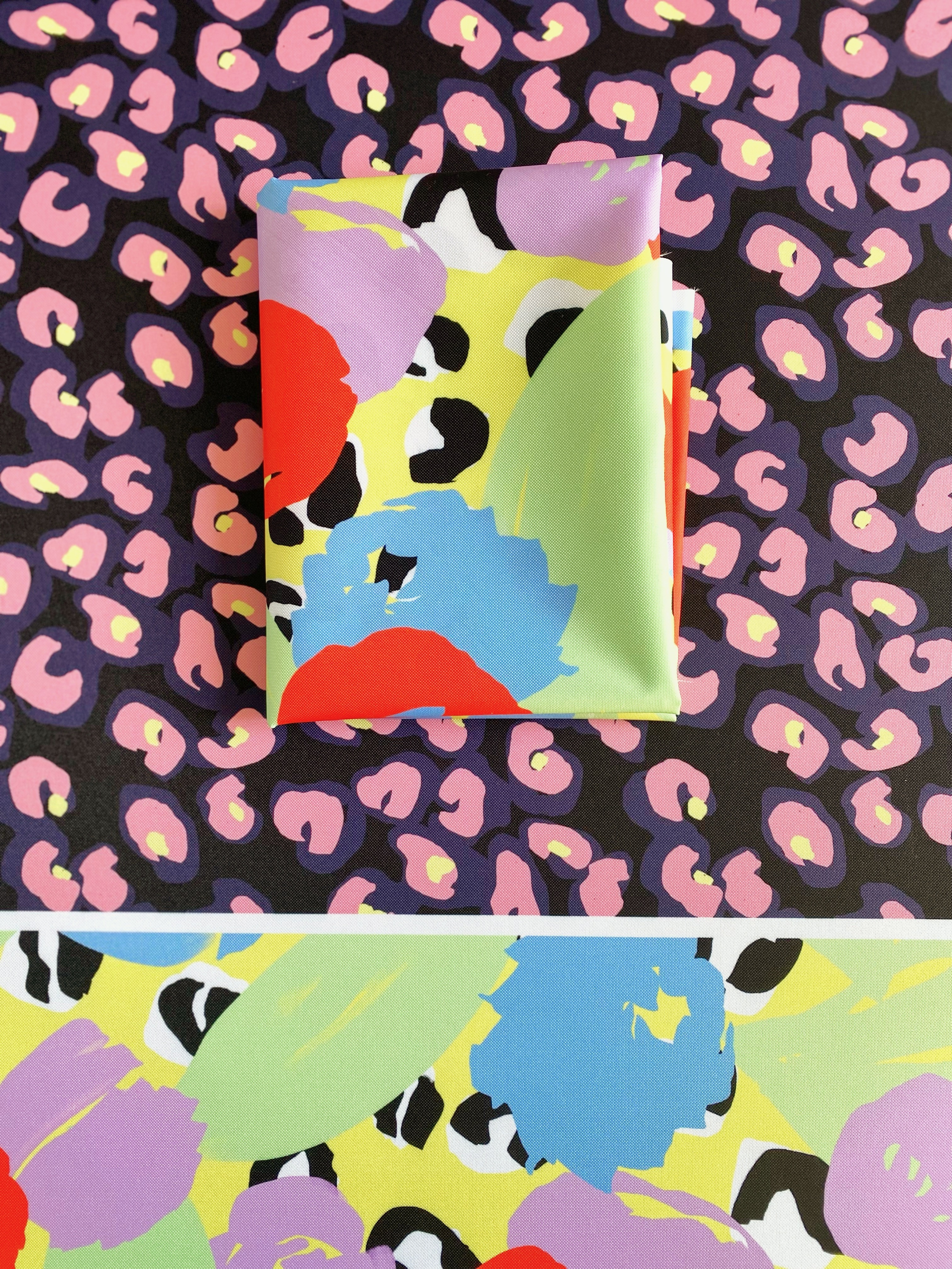 Exotic Joy est un motif exubérant et assumément oversized — de ces imprimés où les formes débordent, se chevauchent et se confondent volontairement. Des fleurs généreuses peintes à grands gestes sur un fond léopard qui apparaît par touches, comme un secret qu’on entrevoit. L’idée, c’était de créer un motif où l’on ne distingue pas tout tout de suite — et c’est justement ce qui le rend addictif.