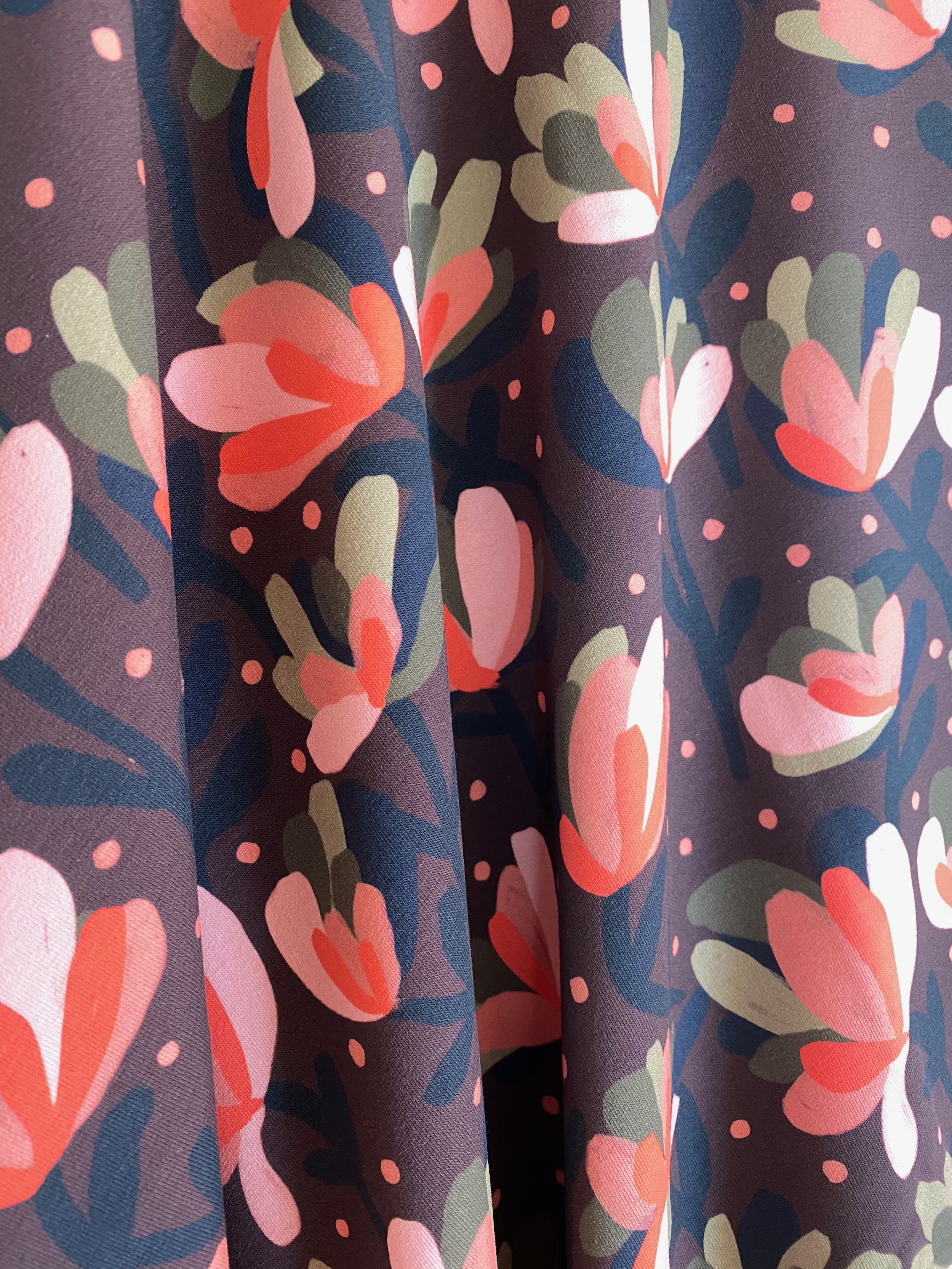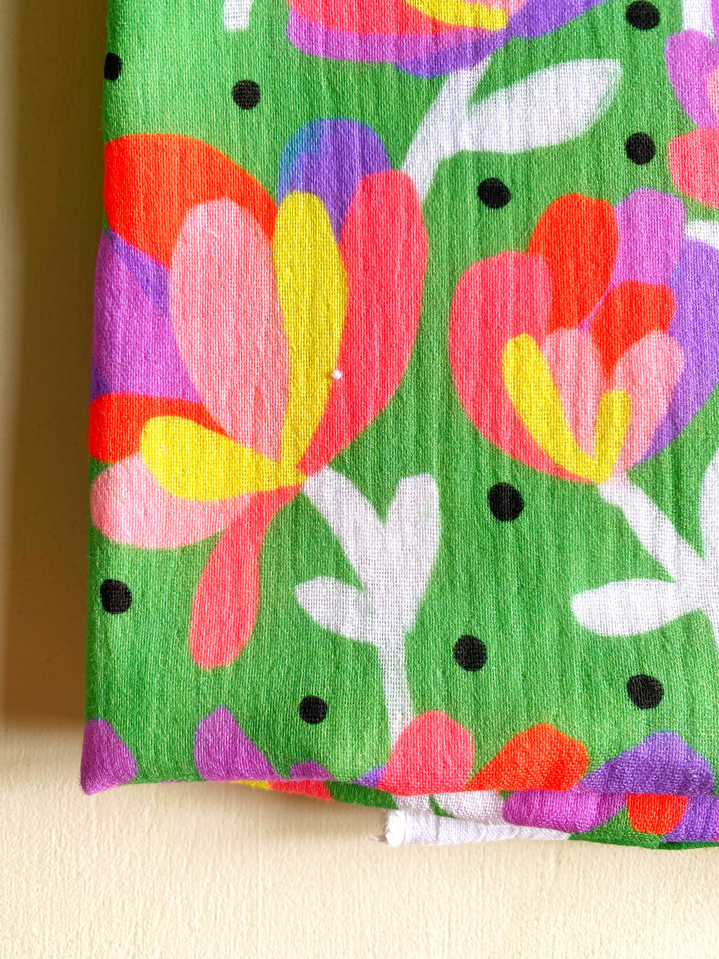 Avec Flowers and Dots, chaque centimètre de tissu vibre d’énergie. Les pois en fond cassent le côté sage du floral et lui donnent un twist inattendu — comme des confettis lancés dans un bouquet. C’est le motif des projets qui veulent du peps, de la joie et zéro retenue : une jupe qui tourne, un sac qu’on repère de loin, un coussin qui illumine un canapé.
