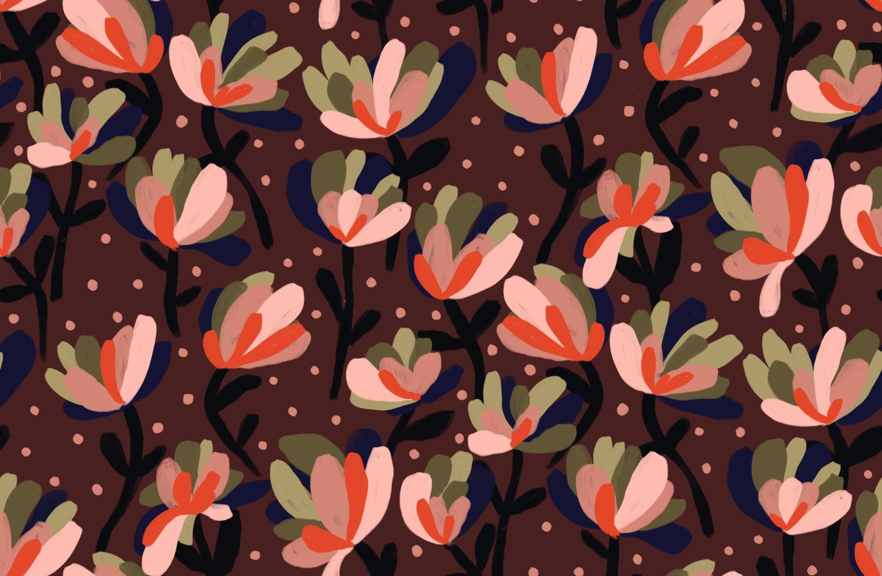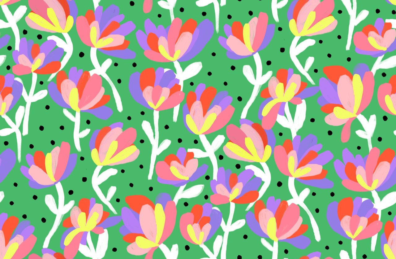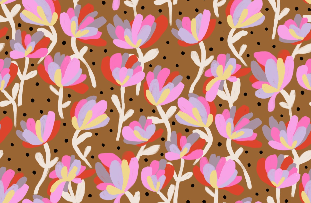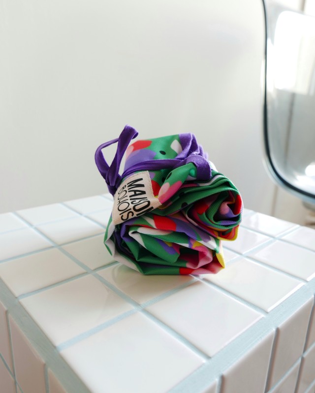 Flowers and Dots, c’est le mariage de deux amours — les fleurs et les pois. Des fleurs peintes aux couleurs éclatantes, montées sur des tiges blanches, le tout parsemé de petits pois noirs en fond qui ajoutent du rythme et de la malice. J’ai voulu créer un imprimé joyeux et généreux qui explose littéralement de couleur.