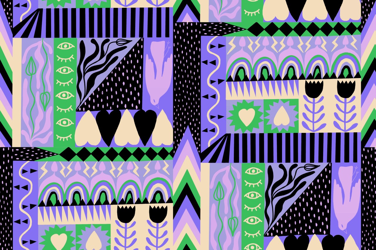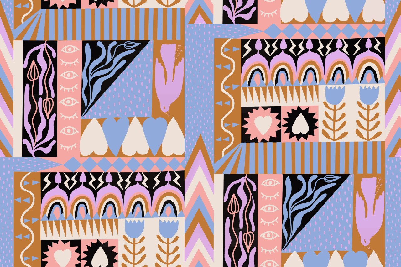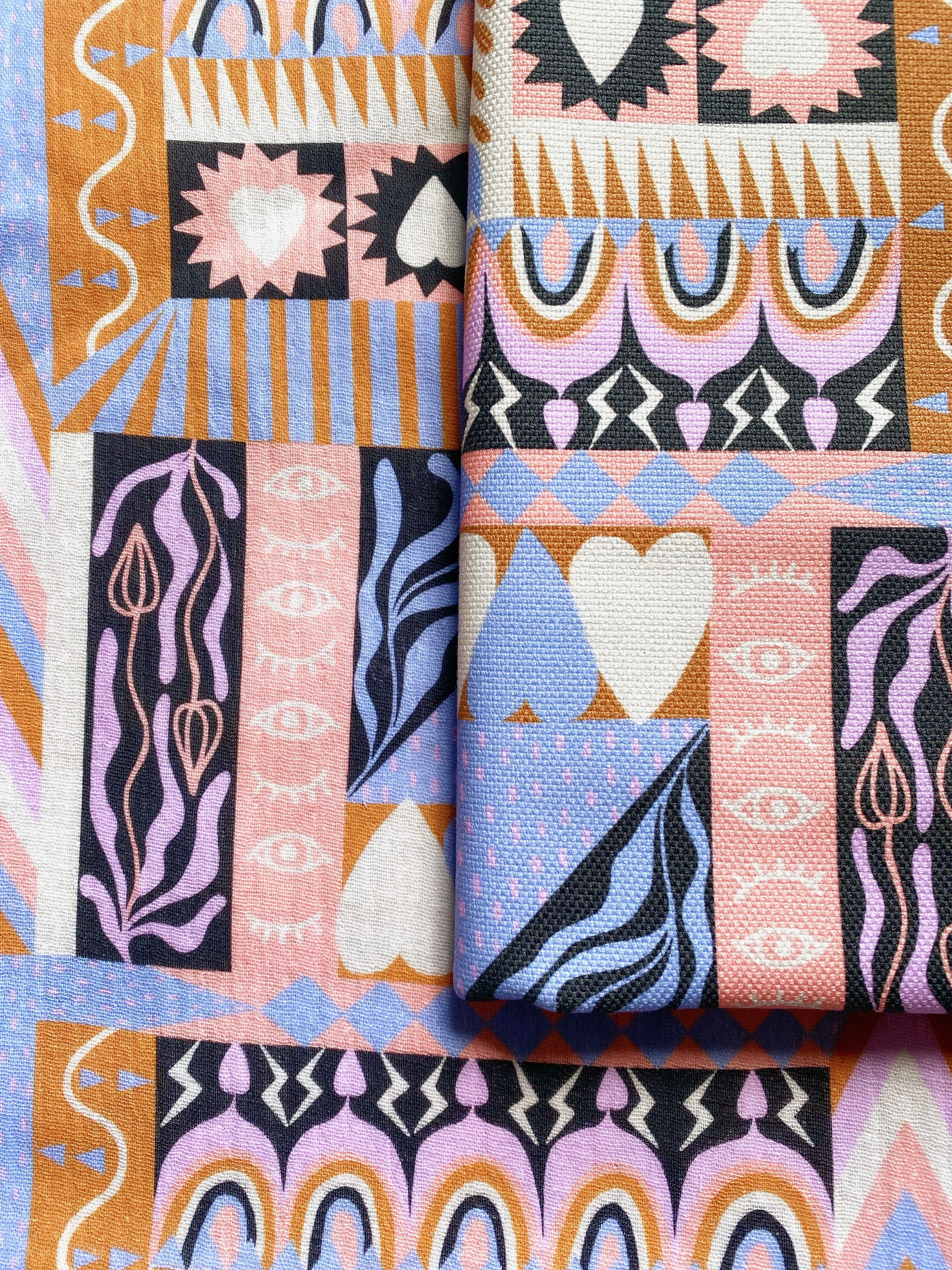 Notre petit patchwork coup de cœur ! Cœurs, symboles et motifs tribaux se mélangent joyeusement dans une mosaïque colorée qui fait sourire. Disponible en douceur pastel ou version peps !