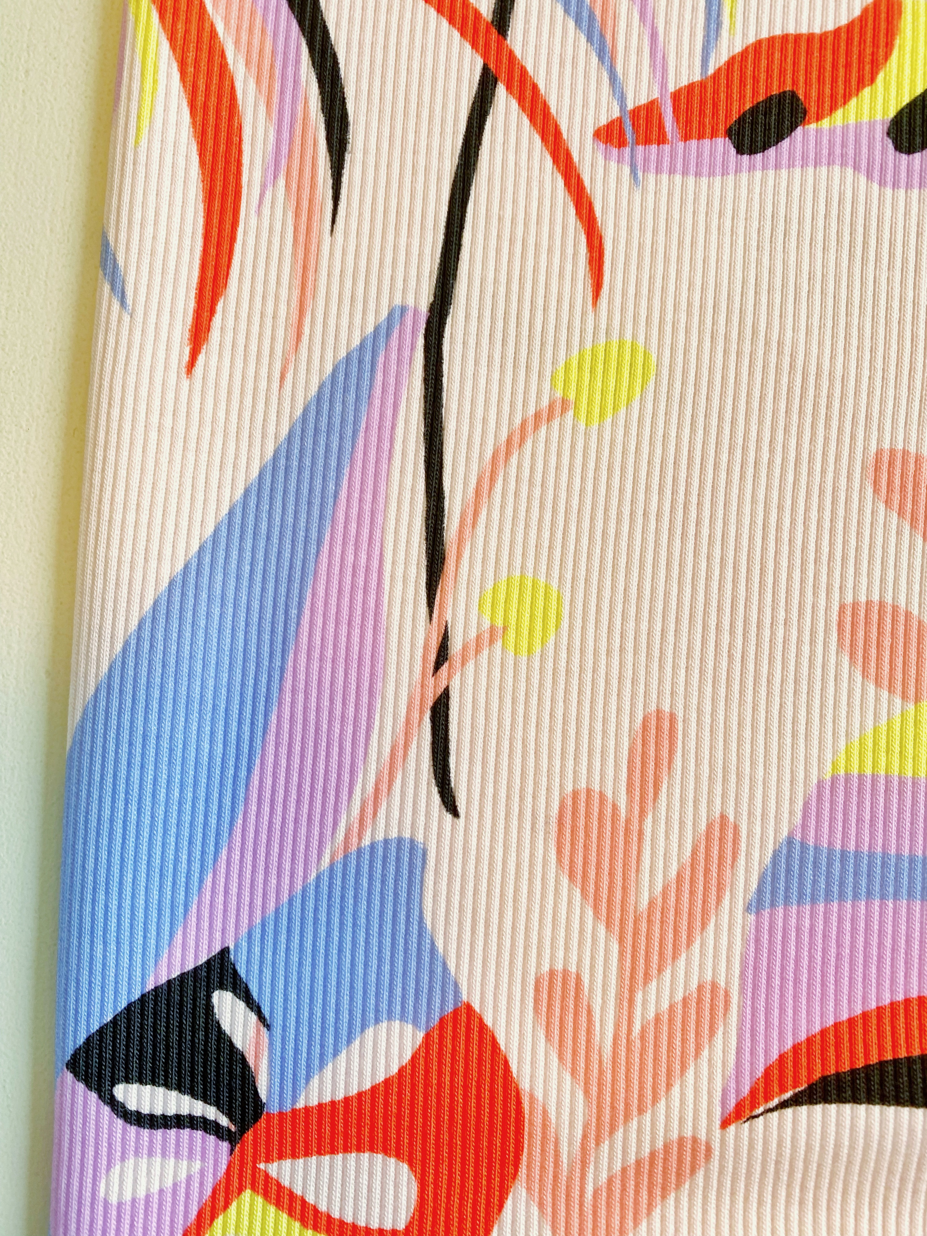 Tropical Block fait partie de mes tout premiers motifs, et il m’a posé un défi de taille : un raccord de 90 cm pensé pour que la répétition soit invisible. L’idée, c’est que lorsque vous cousez un objet ou un vêtement, vous ne voyiez jamais où le motif se répète. Un puzzle floral et tropical composé avec la précision d’un casse-tête.