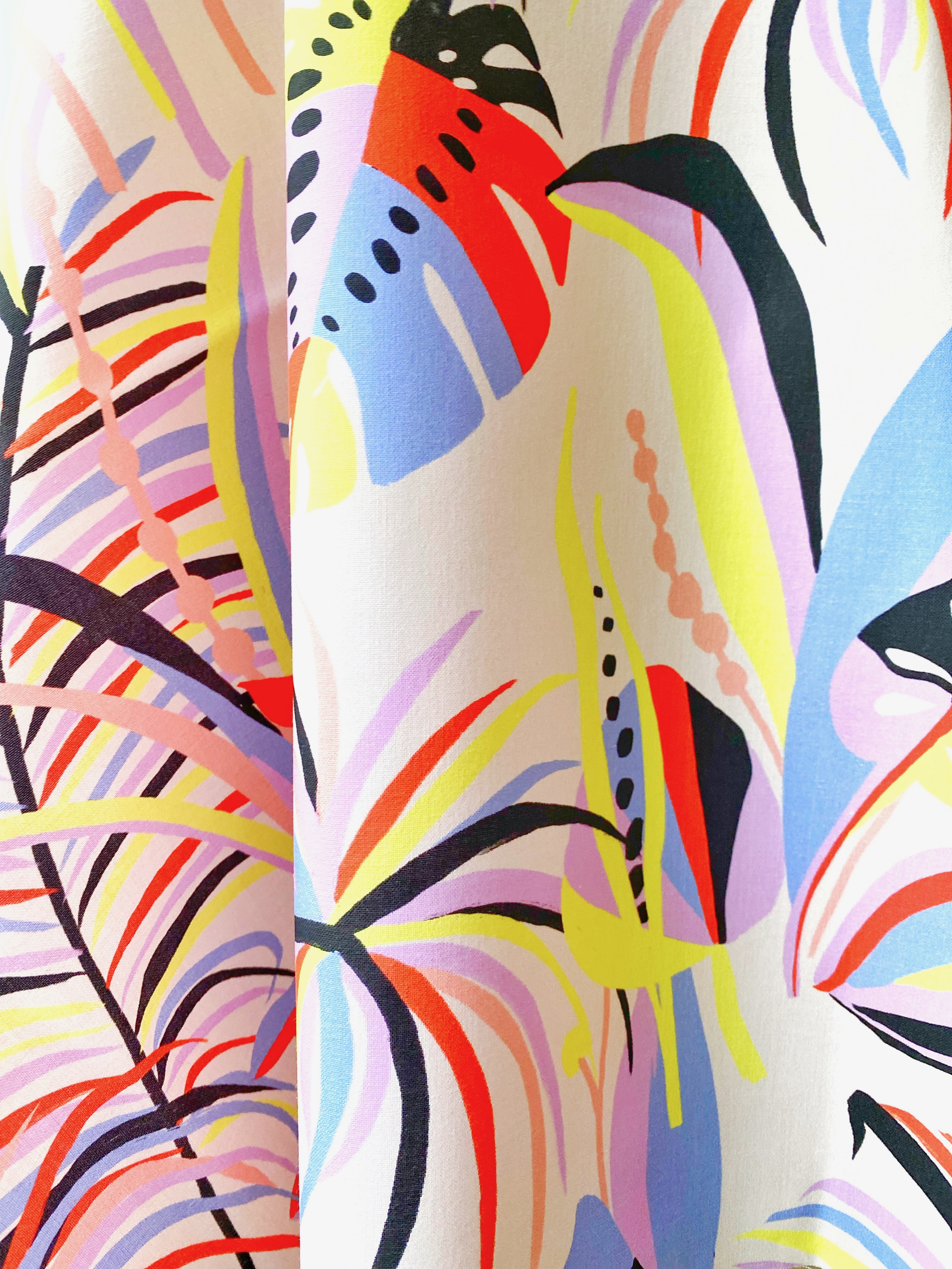 Tropical sans être cliché, coloré sans être criard — ce motif a un équilibre rare qui lui permet de plaire autant aux femmes qu’aux hommes. Son échelle généreuse et son esprit color block en font un allié parfait pour les projets ambitieux : chemise mixte, grand sac de voyage, ou même un rideau de douche qui transforme la salle de bain.