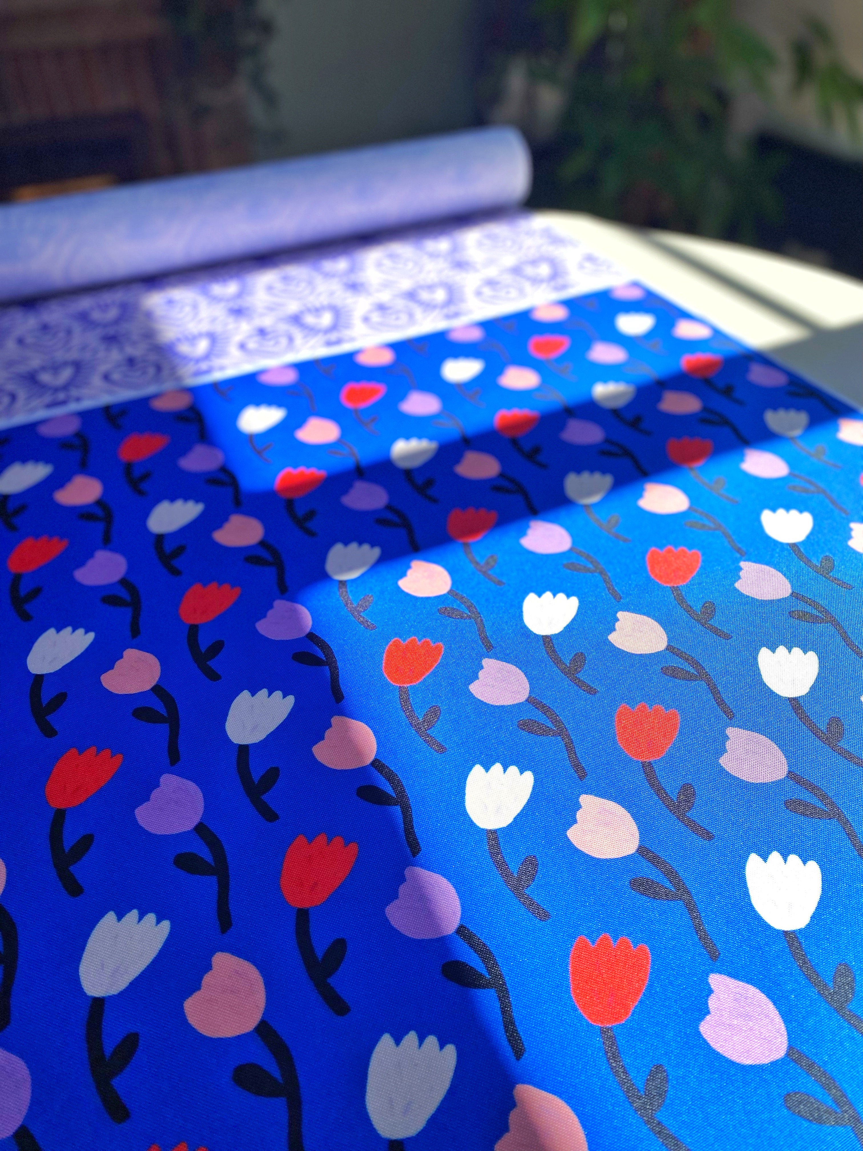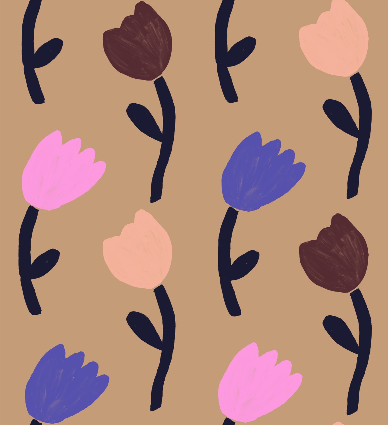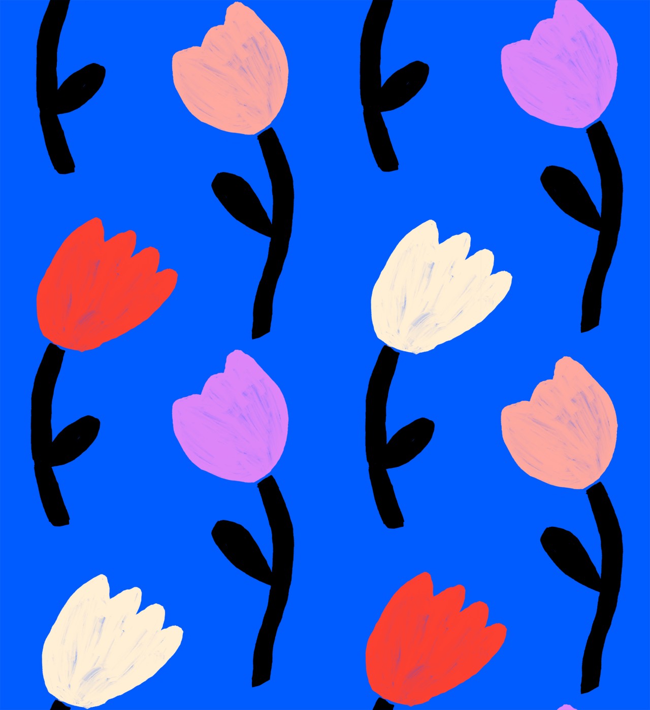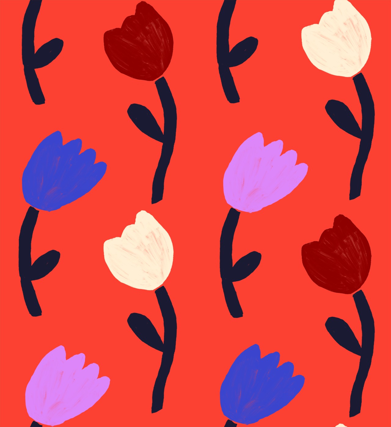 Nos Tulipes sont des tulipes stylisées, recto verso, qui montent et se répondent dans une répétition presque hypnotique. J’ai voulu simplifier cette fleur jusqu’à l’essentiel — une tige bold, une corolle généreuse — et la multiplier pour créer un rythme visuel qui attrape l’œil et ne le lâche plus.