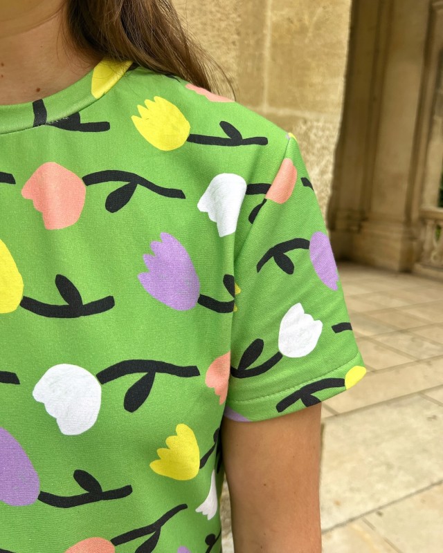 Disponible en cinq coloris ultra-punchy, ce motif change complètement de personnalité selon la couleur choisie — tantôt doux, tantôt électrique, toujours saisissant. Ses tulipes XXL et leur fond vibrant en font un imprimé spectaculaire qui transforme la moindre pièce en déclaration de style. Impossible de passer inaperçue.